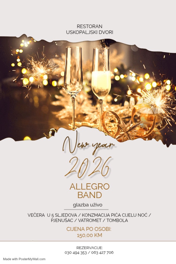 Ako još uvijek tražite mjesto za doček Nove godine u ugodnom ambijentu, restoran Uskopaljski dvori i ove je godine pripremio bogat program za nezaboravnu novogodišnju noć. Uz dobru glazbu, vrhunsku gastronomsku ponudu i veselu atmosferu, gosti mogu očekivati večer ispunjenu zabavom i zajedništvom.