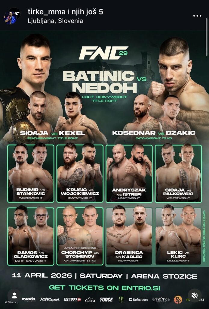 FNC 29 donosi spoj iskustva i mladosti, a večerašnji spektakl u Ljubljani zasigurno će privući veliku pažnju ljubitelja borilačkih sportova, posebno zbog nastupa boraca iz našeg kraja.