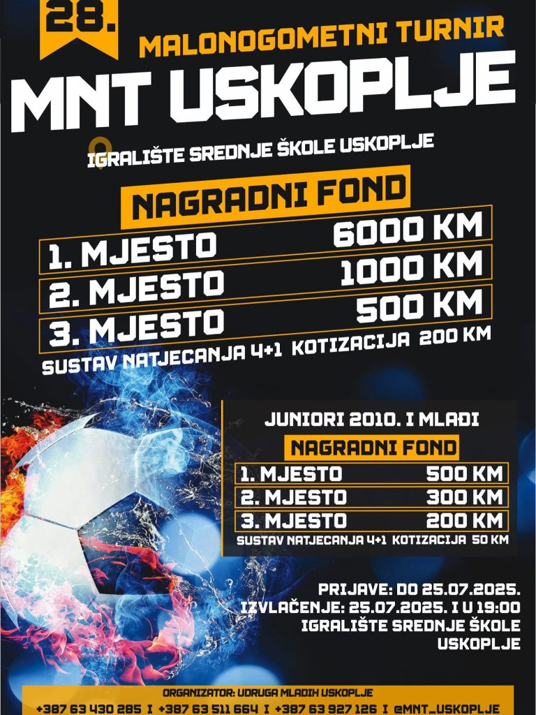 Malonogometni turnir “USKOPLJE ”, u organizaciji Udruge mladih Uskoplje, ponovno okuplja najbolje ekipe, talentirane igrače i ljubitelje malog nogometa!