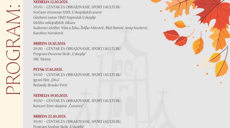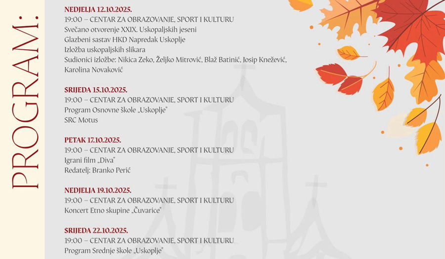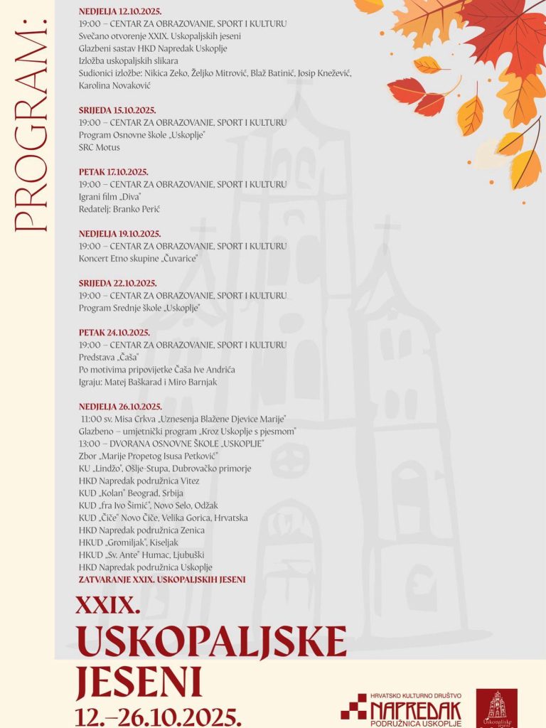 Dragi sugrađani i prijatelji kulture, pozivamo Vas da zajedno obilježimo 29. Uskopaljske jeseni – manifestaciju koja već gotovo tri desetljeća slavi umjetnost, glazbu, film, kazalište i tradiciju našeg kraja!
