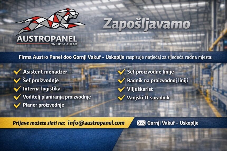 Nova proizvodna firma u Gornjem Vakufu – Uskoplju, koju smo nedavno snimali, sada je i službeno objavila natječaj za zapošljavanje. Riječ je o firmi Austro Panel, koja pokreće proizvodnju sendvič panela i formira svoj tim.