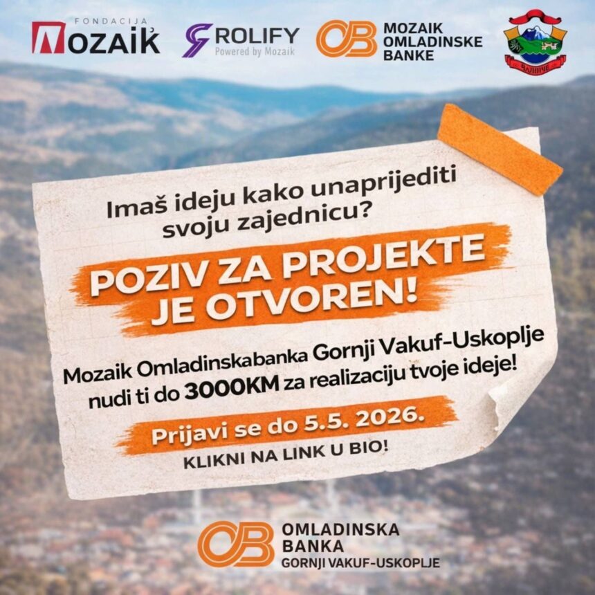 Omladinska banka Gornji Vakuf – Uskoplje objavila je poziv mladima za prijavu projekata kroz program narančastog granta, koji će biti otvoren od 9. travnja do 5. svibnja 2026. godine.