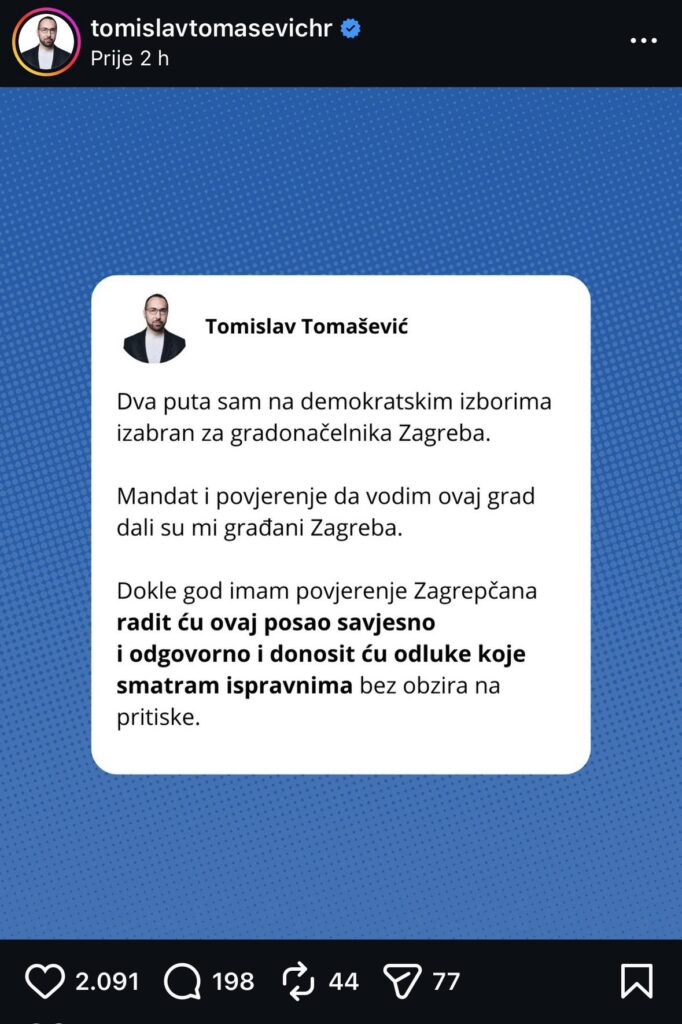 Gradonačelnik Zagreba Tomislav Tomašević oglasio se putem društvenih mreža nakon koncerta Marka Perkovića Thompsona održanog u Areni Zagreb, reagirajući na poruke koje su s pozornice upućene zagrebačkoj gradskoj vlasti.