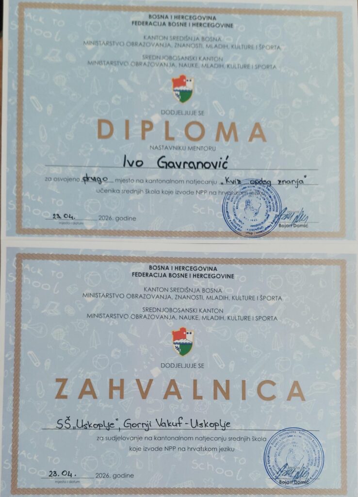 Učenici Srednje škole “Uskoplje” još jednom su pokazali svoje znanje i trud ostvarivši izvanredne rezultate na županijskom natjecanju „Kviz općeg znanja“, koje je održano u Srednjoj školi “Kreševo”.