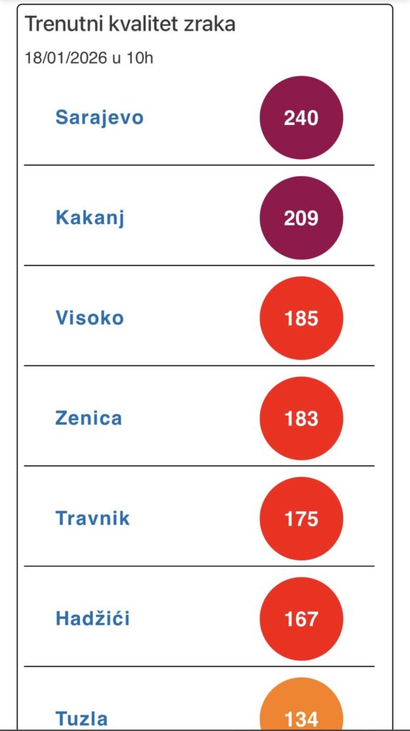 U Tuzli, Brodu, Banjoj Luci i Livnu zrak je nezdrav za osjetljive skupine, dok je umjereno zagađen u Doboju, Prijedoru, Ivan Sedlu, Tešnju, Mostaru i Gacku. Zdrav i nezagađen zrak jedino je u gradovima Bihać i Trebinje.